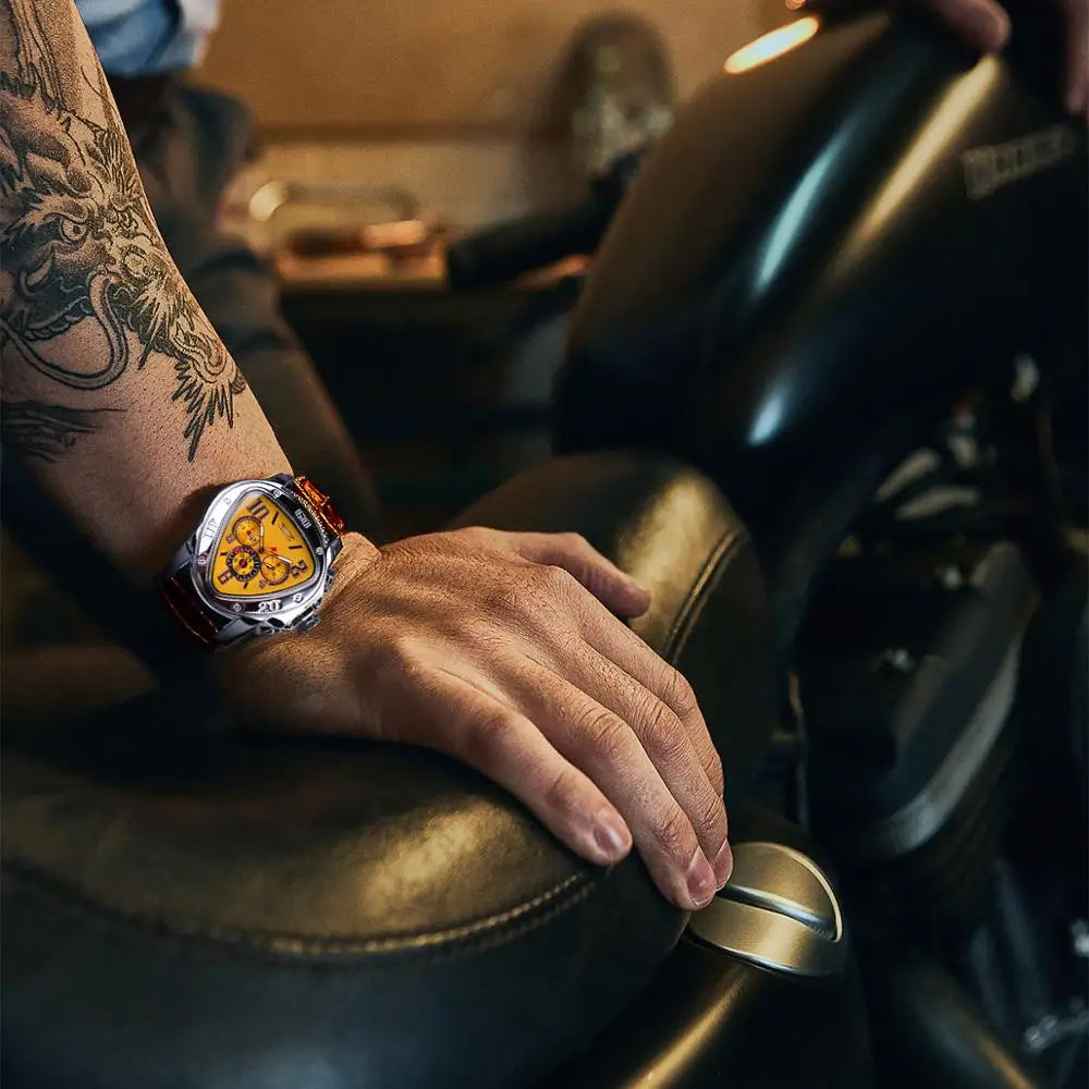 The Jaragar Tri-Edge GT5 951 breaks away from conventional watch design. Its distinctive triangular stainless steel case delivers instant presence, while the vibrant gold-tone dial with multi-functional sub-dials creates a dynamic, performance-driven aesthetic. This is a timepiece built for confidence — bold, masculine and unapologetically different.