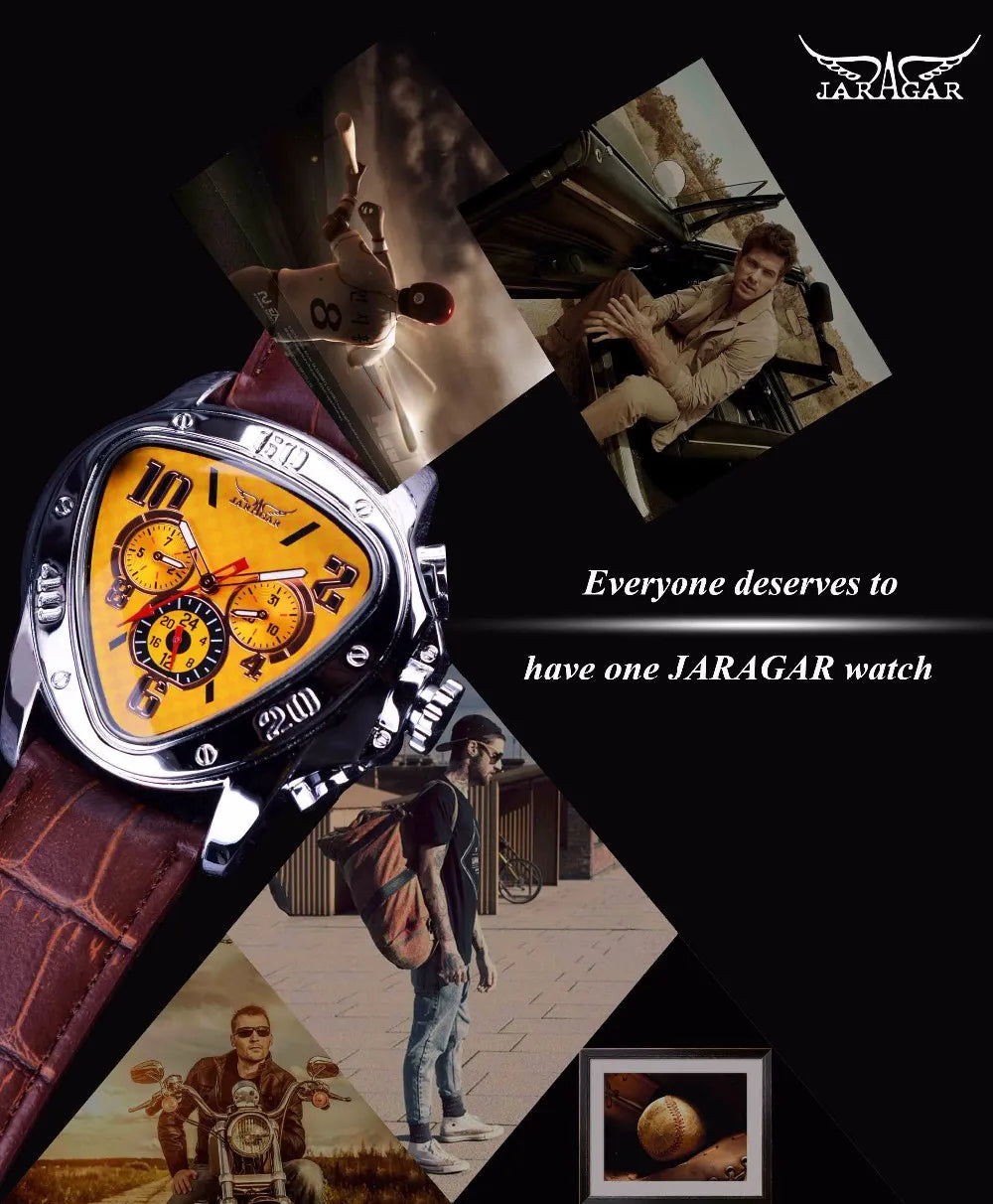 The Jaragar Tri-Edge GT5 951 is designed for men who refuse ordinary — a striking triangular case with a powerful golden dial that commands attention instantly.